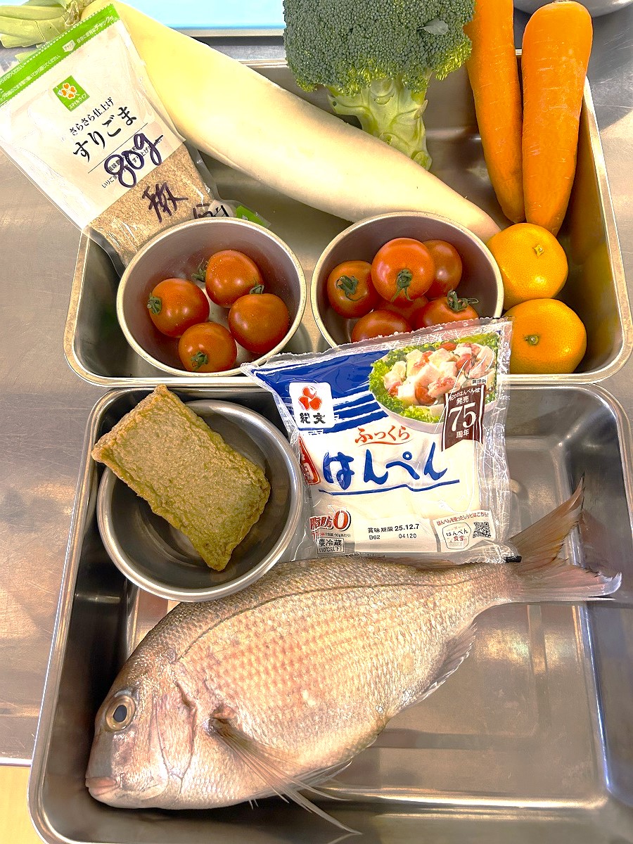 本実習のメニューは「長崎天然真鯛のお刺身~ごまだれ漬け~、長崎県産大根と天然真鯛のアラ炊き、卓袱料理お鰭風お吸い物、長崎産野菜サラダ、じゃこ天、長崎みかん」となり、長崎県の食材をふんだんに使った料理になりました。使用の食材は、長崎県様から「ブロッコリー・大根・人参・トマト・みかん・長崎県産ジャガイモを使ったドレッシング」をご提供いただき、弊社からは「長崎県産天然マダイ、長崎てんぷら」を提供いたしました。調味料も極力長崎県産にこだわりました。