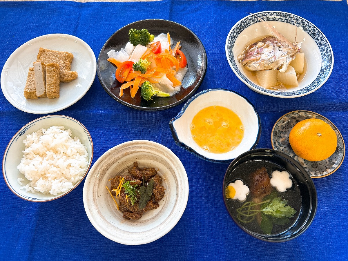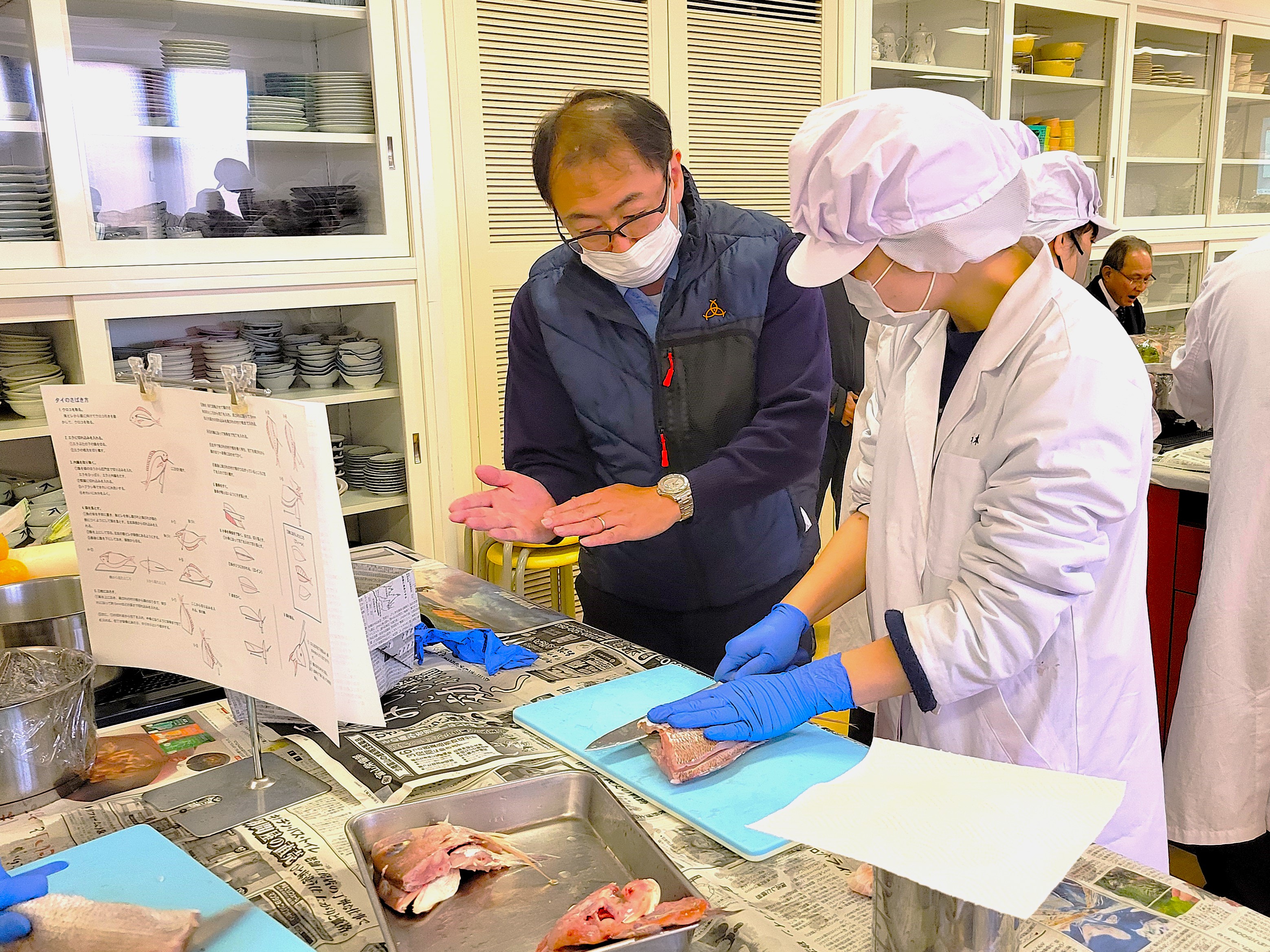 今回のレシピは、長崎県産の天然鯛を主軸に置いたもので、お刺身はごまだれ漬けにし、長崎県の郷土料理である卓袱料理に出されるお吸い物を作り、出たアラや頭は大根と煮つけにしてアラも捨てる所なく調理して食べることができました。2人で1尾を捌くようにしたため学生たちが魚に触れる機会を多く設けることもできました。普段あまり会う機会の少ない合同クラスでの実習だったようですが、学生たちは班で協力して助け合いながら作業をしていました。体の向きや包丁の持ち方の工夫を伝えるとすぐに吸収して実践していました。