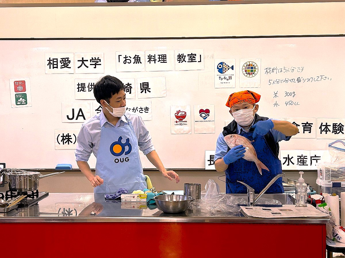 本年度も、相愛大学様にて11月29日に「お魚料理教室」を長崎県大阪事務所、長崎県農産加工流通課様と共催で行いました。人間発達学部 管理栄養学科 1年生 合計36名に実習をしました。