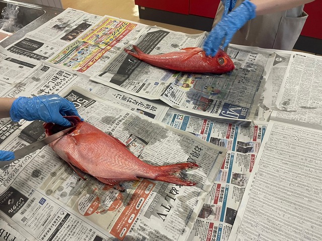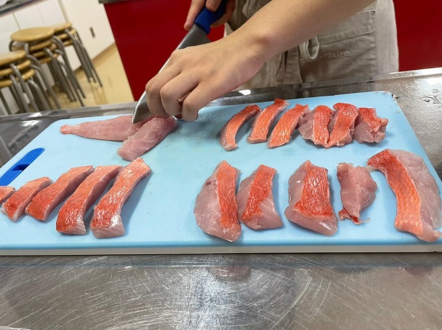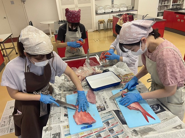 相愛大学 料理研究部6名が「第23回シーフード料理コンクール」に応募しました。弊社は食育活動の一環として「キンメダイ」を5尾提供し、お魚の知識・捌き方をお伝えしました。