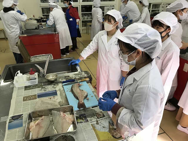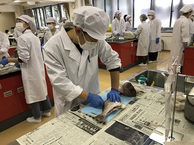 11月10日、12日の二日間で相愛大学人間発達学部 発達栄養学科の1年生合計76名を対象に2日に分け、愛媛県大阪事務所、国産水産物流通センター(大日本水産会)の協賛のもと、毎年恒例の「お魚料理教室」を行いました。