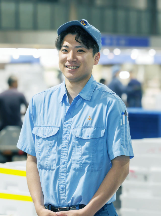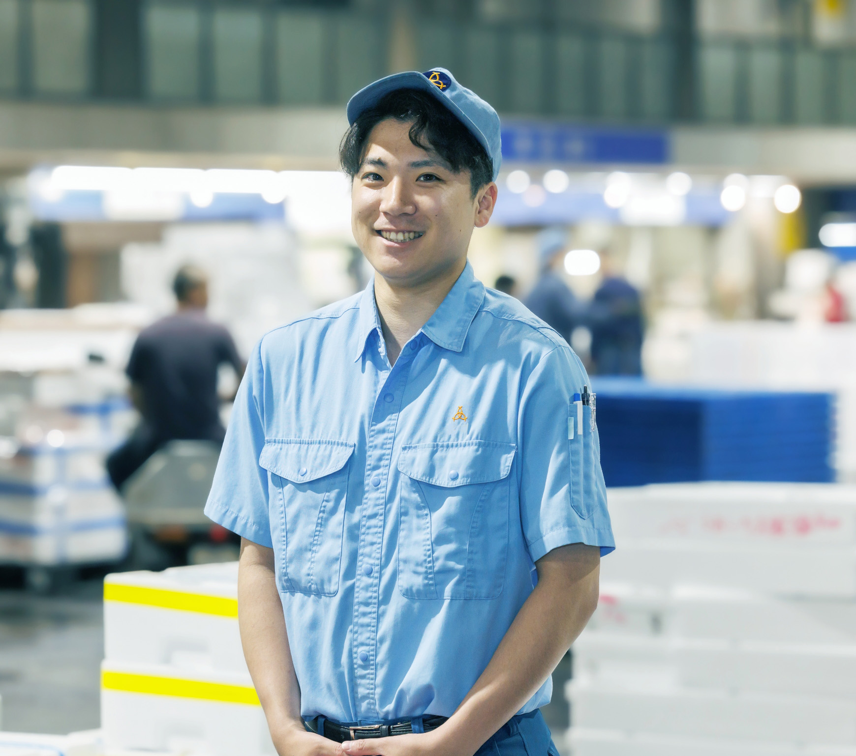 熊本の浜で育ち、実家も仲卸業を営んでおり、自然と水産業界に親しんできました。その中で、業界をリードする存在であるうおいちのスケール感に惹かれ、入社を決意しました。朝3時に出社し、水揚げされた鮮魚を自らの目と手で確かめながら品質を見極めます。セリを経たあとは、集荷・配達・商談・売上管理まで一貫して担当しています。