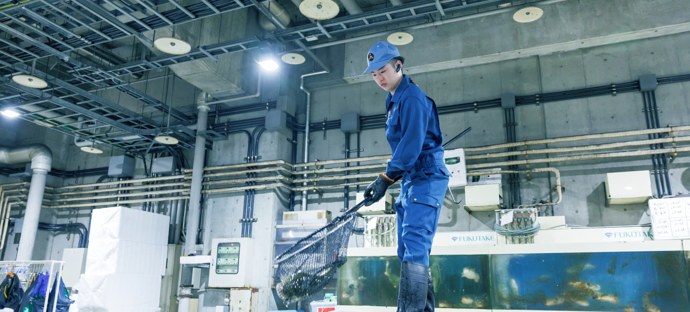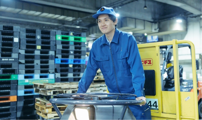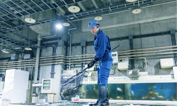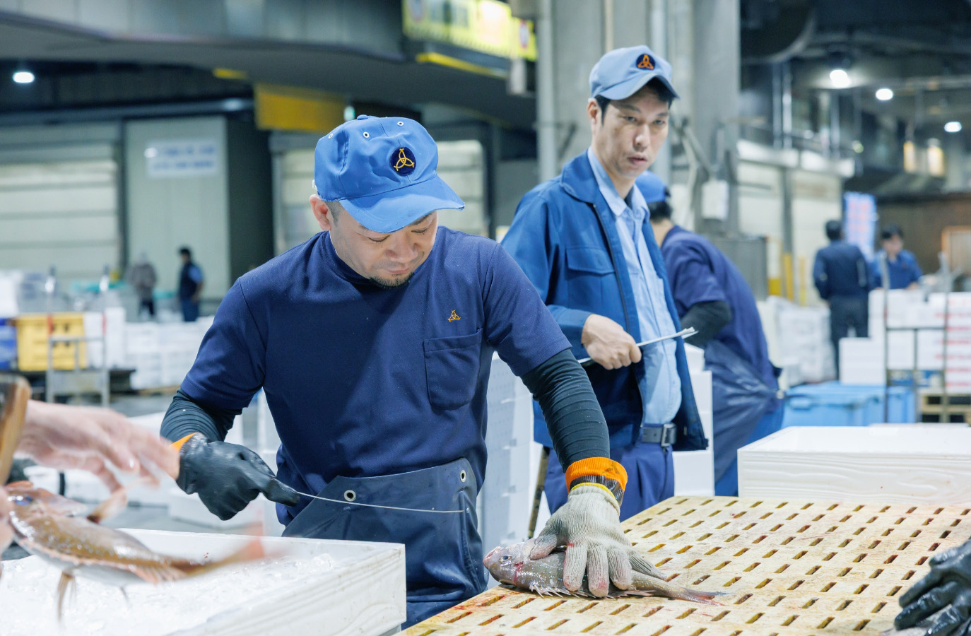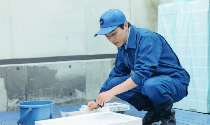 - 日々、卸売場で最初に商品を確認し、市場から出荷するせり売りの準備や活魚の締め作業を行い、商品をターレット等に乗せて仲卸業者へ配達します。